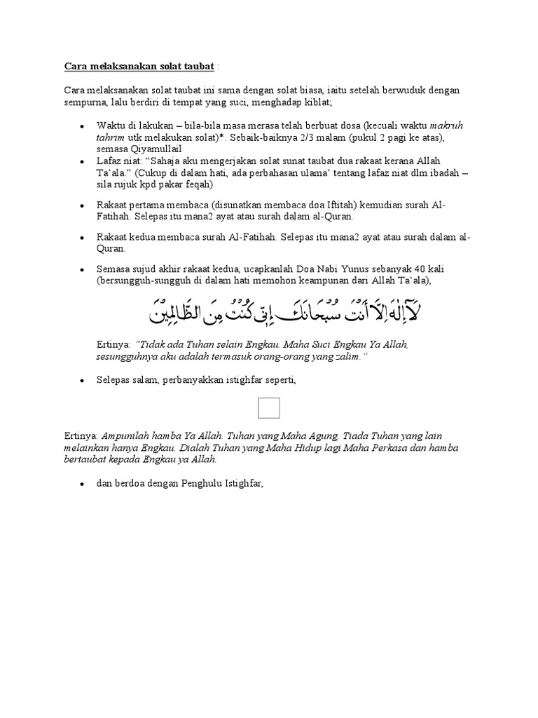 3 from Cara cara mengerjakan solat sunat taubat blog md ruzai solat taubat doa taubat panduan lengkap rumi aku islam ustaz don daniyal fan page tajuk solat sunat taubat syarat syarat taubat 1 ikhlas ingin bertaubat 2 tidak akan mengulangi perbuatan dosa itu lagi 3 menyesal atas perbuatan yang telah dilakukan Semasa sujud terakhir pada rakaat kedua (sebelum duduk tahiyyat akhir) iaitu selepas membaca tasbih biasa, bacalah. (panduan ini adalah salah satu cara menunaikan solat sunat taubat) tidak ada keterangan khusus berkenaan solat sunat taubat secara terperinci. Berwuduk / mengambil air sembahyang Untuk rakaat pertama solat sunat taubat, ikuti langkah berikut: Cara menunaikan solat sunat taubat. Niat solat taubat niat sahaja aku mengerjakan solat sunat taubat dua rakaat kerana allah taala. 2. Kemudian menyesali atas perbuatan itu dan ingin kembali semula ke jalan allah (bertaubat).